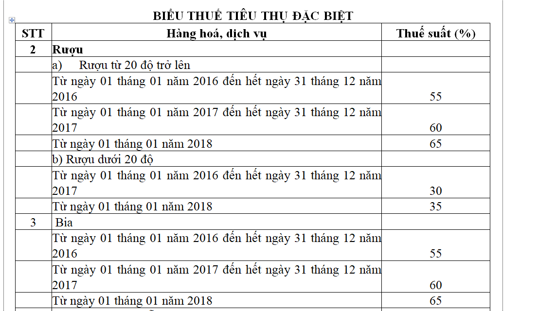 2) Thuế tiêu thụ đặc biệt: đối với mặt hàng Rượu thì thuế tiêu thụ đặc biệt được tính theo biểu thuế như sau: