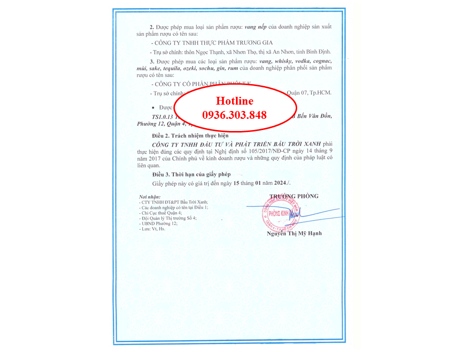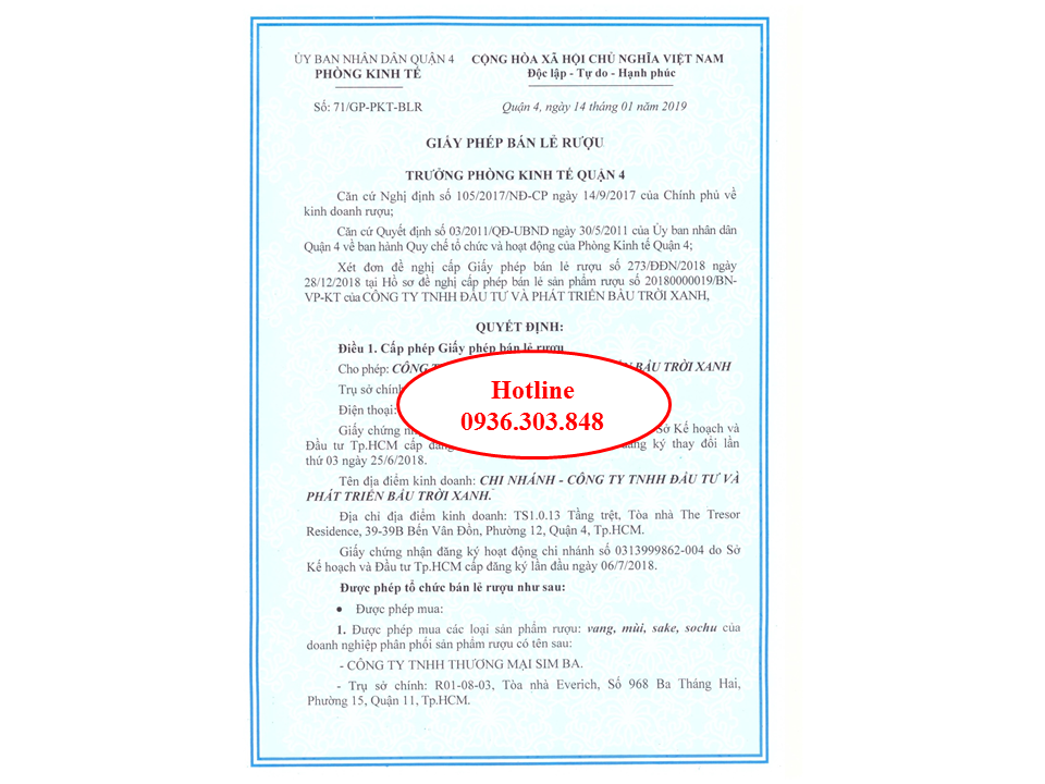 Luật Nguyễn Gia chuyên cung cấp xin giấy phép kinh doanh rượu trọn gói, tư vẫn miễn phí, hỗ trợ hướng dẫn khách hàng trọn đời trong công tác báo cáo và chuẩn bị tiếp đoàn. Liên hệ Dịch vụ tư vấn xin giấy phép kinh doanh rượu của Luật Nguyễn Gia qua hotline: 0936.303.848 (Mr. Hùng) hoặc trực tiếp văn phòng Công ty TNHH Luật Nguyễn Gia; Số 10 Lê Bình, phường 4, quận Tân Bình, Tp. Hồ Chí Minh